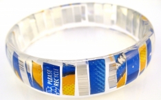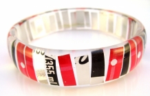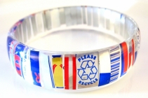 Crafted in Luxane™, a state-of-the-art polyurethane resin, slices of recycled cans have been embedded within each bangle. Learn more about Luxane. The cans themselves are made from 51% metal that has been previously recycled,